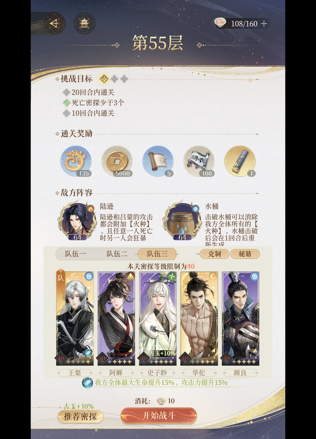 阵容分析:因为本关要不断打水属性的水桶消BUFF,阿蝉是土属性有伤害加成,是打水桶的不二人选。这里的主输出是华佗,比较另类,可替代。狮子喵王粲颜良就不说了,黄金三人组。