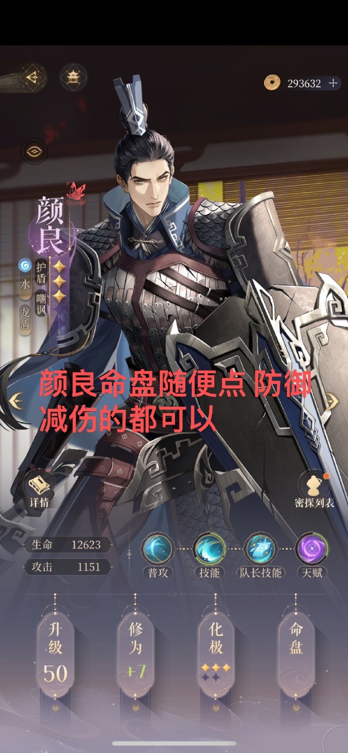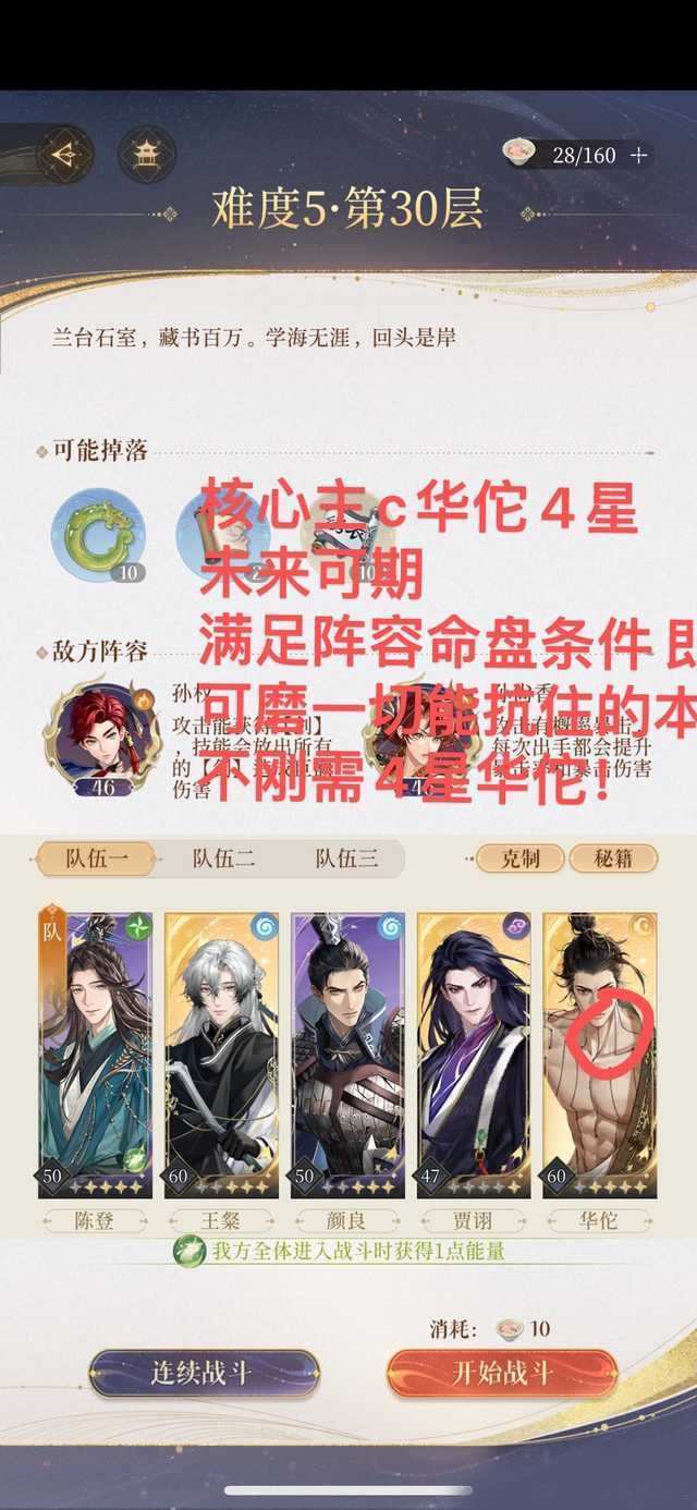 练度我发在下面了,颜良命盘随便,王粲一定要是同生共死加冷却减少加盾(王粲的奶量巨高 这个盾是吃攻击力)开局陈登大招一放,双盾一开,贾诩和华佗都拉防御,下回合开大基本都是满血输出,如果你没有王粲,那就得拿两盾两奶来赌华佗满血,狂赌之鸢嘛,总之还是比杨修丢双6好赌的。