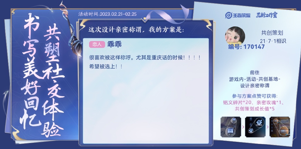 乖乖、小趴菜、小跟班、大冤种,小伙伴们打游戏时有没有互相这么称呼过? 本次设计亲密称谓活动结束后,官方评选出了多个获奖方案。 后续版本中亲密关系将会拓展为7类:恋人、姐弟、兄妹、兄弟、死党、闺蜜、姐妹。 所有获奖方案都将有机会进入游戏中成为新的亲密称谓。