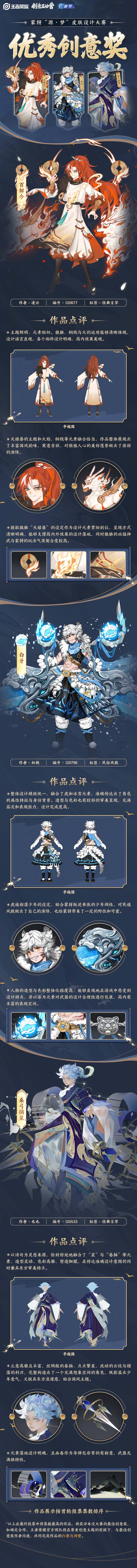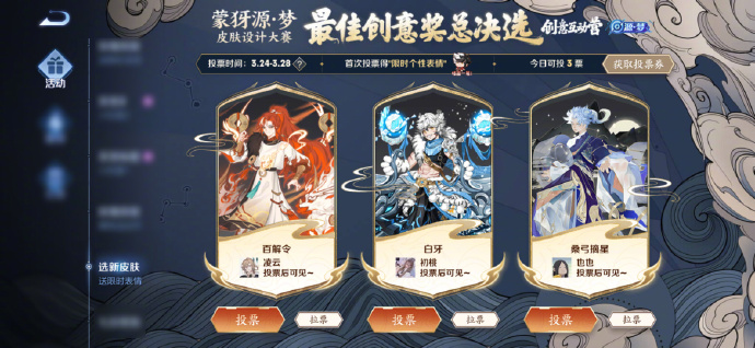 经过蒙犽皮肤设计大赛首轮投票及公示,共30份高人气作品获评本次大赛的人气创意奖。 在此基础上,由内外部多位专业评审组成的官方评审团,从创意度、"美学·叙事·玩法"三要素契合度、实际开发可行性等维度出发,在30个人气创意奖作品中综合评估选出了3个相对更优方案,为其授予了本次大赛的优秀创意奖。这3个作品将进入到最终投票环节,从中诞生下一款源梦新皮肤! 3月24日-3月28日,大家可以前往【游戏内大厅-活动-选新皮肤】参与投票,得票数最高的作品,将获得本次大赛的最佳创意奖! 参与投票还可获得限时表情“技高一筹!”,小伙伴们赶快来投票支持或分享自己心中的最佳创意奖,助力其成为蒙犽“源·梦”新皮肤吧!