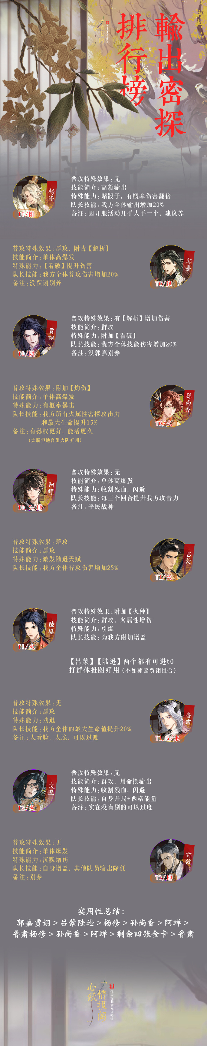 密探排行榜一览分享 看前须知: 1.从上往下即为培养优先级,举例在郭嘉后面写的没贾诩别养,意思是有杨修的情况下! 没有杨修也没有吕蒙陆逊组合的情况下,单养也是可以的! 2.排行榜内只有金卡以及紫卡,蓝卡一个都不要养!浪费资源。 3.一般配对阵容为两输出+两盾+一奶/两输出+奶+盾+辅助 。 前期可能没有奶的情况下,还是不推荐去养蓝卡,可以先三输出+盾+辅助慢慢打。 4.平民必养为杨修(目前版本单体NO.1),阿婵,颜良,史子眇(可能比较难抽),陈登也可以养(打火机)。 5.三个图分别是输出、辅助、盾,输出是长图记得下拉。 补充: 以下排名仅从技能强度讨论,命盘改命&升星修为&羁绊等对密探的强度也影响! 华佗,改命后更T0 颜良,如果在没有王粲情况下,作为群体盾的颜良效果更香!