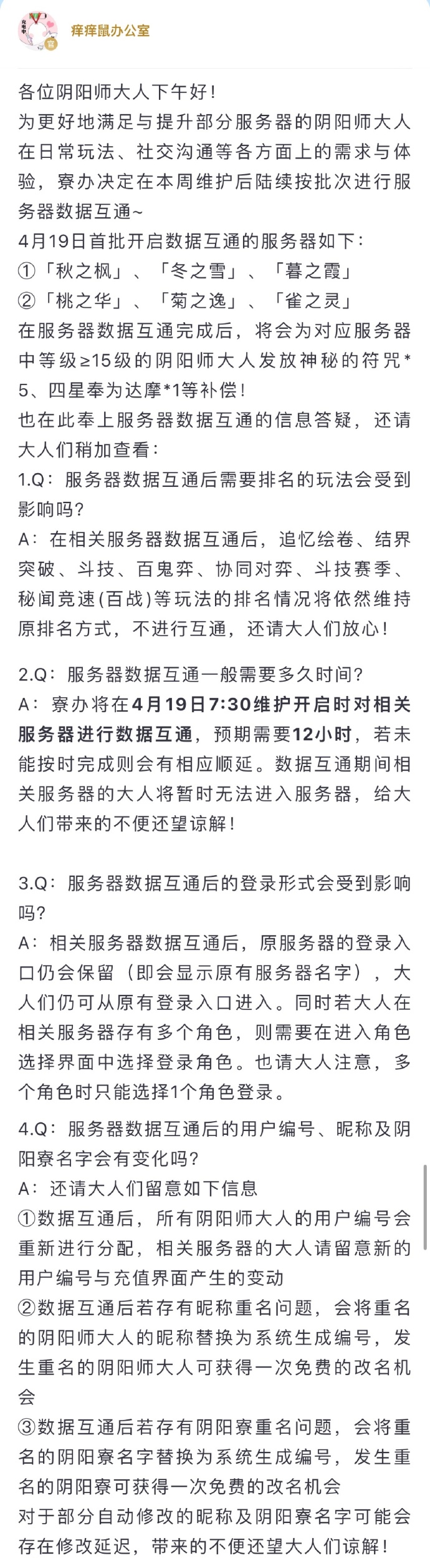 4月19日首批开启数据互通的服务器如下: