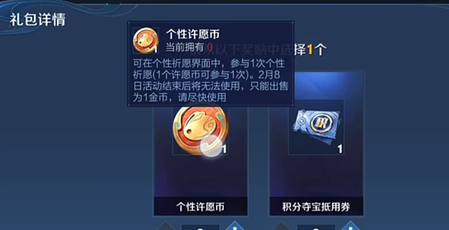 好运自选宝箱:打开后可任意选择以下奖励之一:个性许愿币*1、积分夺宝抵用券*1
