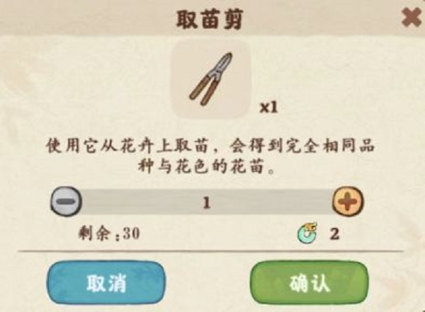 在杂货铺内,花苗的价格换算下来与取苗剪需要的物资是同等的,所以对于取苗剪的使用可以在花种兑换上限、仅育种可得出的花卉上。