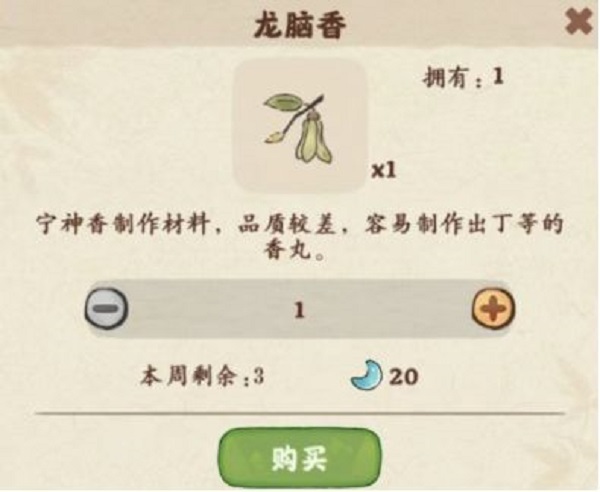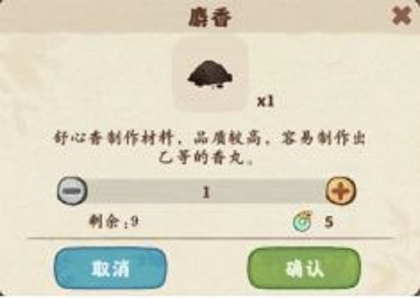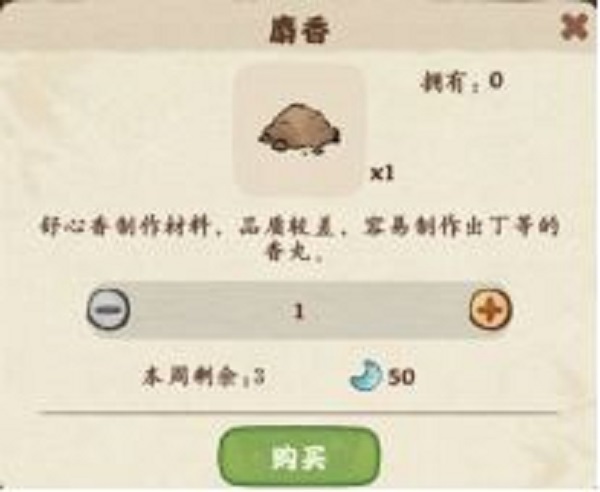 香料,为香丸制作的必需品,可在杂货铺购买获得,并有不同的等级,其等级高低会影响制作出的香丸质量。