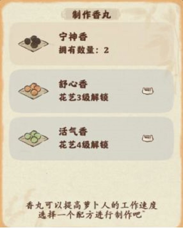 香丸,是花卉与香料合成的产物,其作用是减少提高生产建筑中萝卜人的效率,可以持续15分钟,简直生产利器!产出的香丸也会根据等级有不同的提升效率。能够制作的香丸也会随着花艺等级的提升增加!
