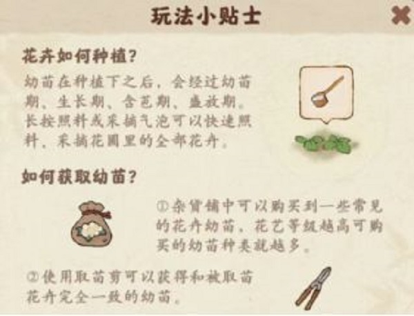 除了幼苗,我们还会在花圃玩法中接触一些道具——取苗剪、取粉笔、香料、香丸。