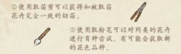 取苗剪,山遇商店或杂货铺购买可获得,使用取苗剪可以获得和被取苗花卉一致的幼苗,可以理解为复制种子的道具。取苗剪需要在花卉采摘前进行操作,即只有在采摘前使用取苗剪道具才能获得相同的幼苗。