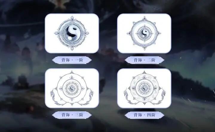 求道之初,道心初具雏形,具象化为一阶背饰,是一个太极八卦盘;锤炼问心,道心渐渐圆满,具象化为二阶背饰,在一阶基础上增加更多细节;而后继续攀登大道,逐渐悟出自己的道,具象化为三阶背饰,圆满的道环中露出锋芒;最终完善自身之道,问鼎大道,获得四阶背饰,样式更完整华丽,但却给人至简至繁之感。