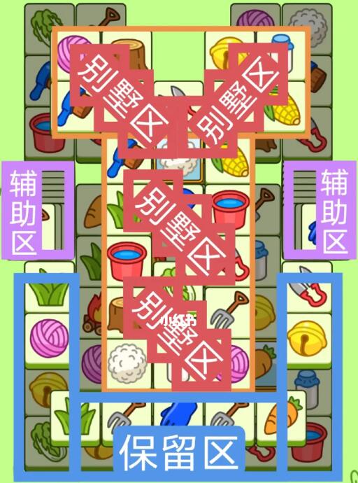 四个斜着的长形别墅,开局先消除橙色区,然后按照一层层均匀消除表面牌,哪里压牌比较多就先消除哪里,必要时可以用盲盒区辅助消除表面牌。尽量还是以别墅区内互相消除为主,蓝色区有叠牌,但是不多,全部保留到后期使用。