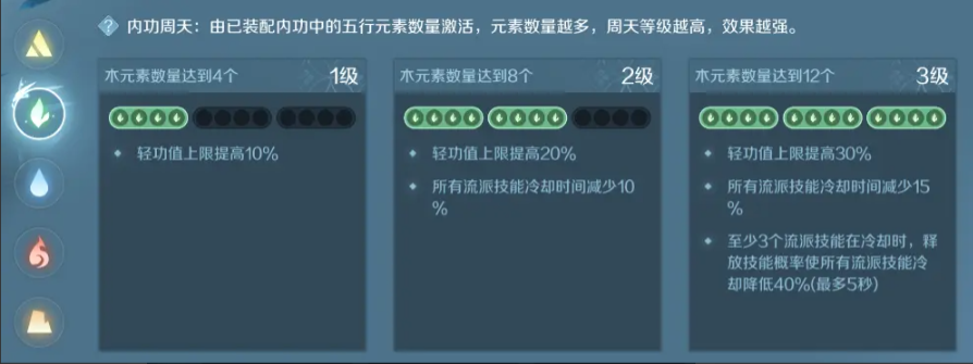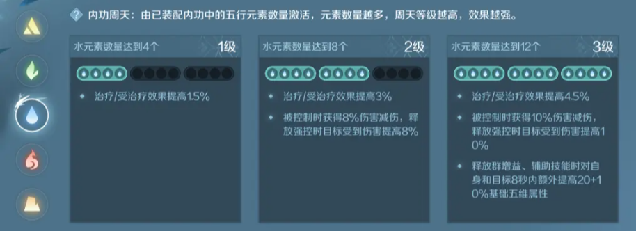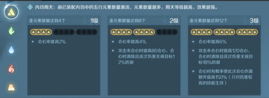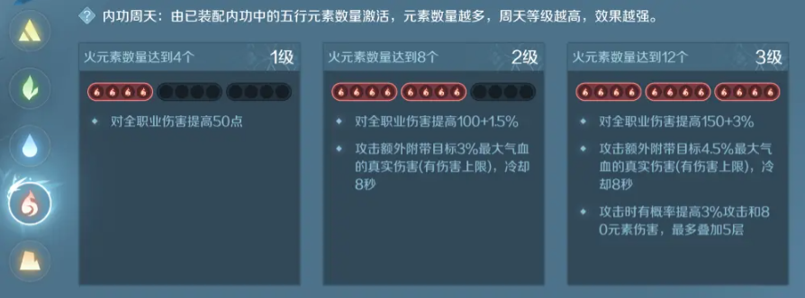 4.火元素:纯输出向的效果,效果包括全职业伤害提高、短CD的真实伤害和叠加攻击Buff。