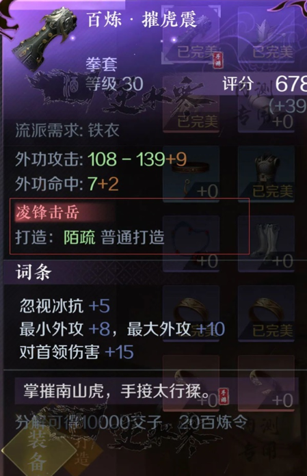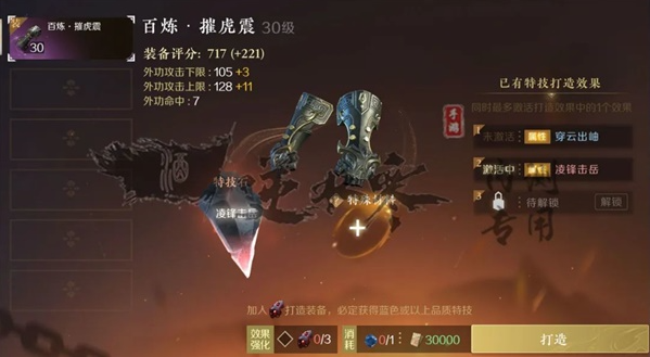 如图,只有百炼装备可以进行打造,一个百炼装备拥有三个特技孔,但只能选择其中一个进行激活。普通打造需要消耗凌云玄铁。