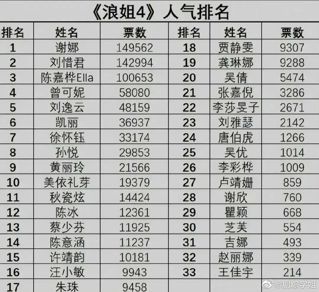观看地址:点击进入 浪姐4首期播出时间暂定在5月初开播,每周五播出。 4月17进行了一公录制。 播出时间按照去年,就是录制三公那一周的周五中午12点。 上期当时周一录制三公王心凌当上队长,周五首播她全网爆火! 根据排行榜数据显示,在《浪姐4》的33位姐姐中,不乏知名度不错的姐姐,开局不错,获得了很多网友的支持。 其中,得票最多的当属太阳女神谢娜。他以72万票位列第一,遥遥领先。从公民身份和人格魅力来看,谢娜有一张好脸蛋,颜值高,更容易在这种秀场上不留手脚,靠着人格魅力吸引眼球。 被谢娜打败的第二个刘惜君是女超人的代表,充分利用了平台的力量和全国的人气。今天,刘惜君参加节目浪姐4,就是为了展现他最令人印象深刻的VOICE力量。