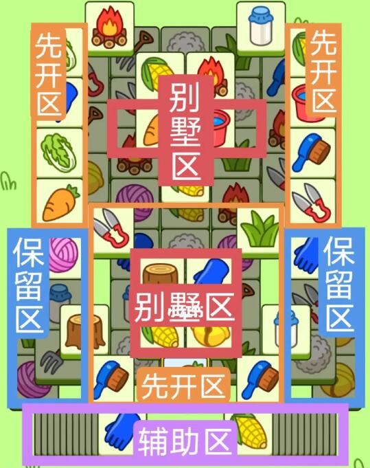 【第二关】 1.今天主要消除的地方在红色区。 2.开局先消除橙色区的牌,这里压牌。尽量要让牌面保持在同一水平面,然后一层一层消除表面牌,不要跨层太多拿牌,等表面牌消除完后,以大别墅内互相消除为主。 3.必要时可以用紫色盲盒区辅助消除,盲盒区后期不用留太多,留几张备用即可。 4.蓝色区能不动就不动,里面的叠牌不多,一定要保留到最后使用。