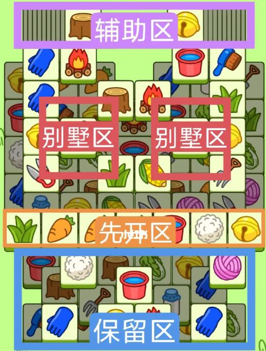 一个十字型大别墅,一个方形大别墅,可以用缝隙看牌法探底牌,开局先消除橙色区,然后按照一层层均匀消除表面牌,哪里压牌此较多就先消除哪里,必要时可以用盲盒区辅助消除表面牌,尽量还是以别墅区内互相消除为主,蓝色区有叠牌,但是不多, 全部保留到后期使用。