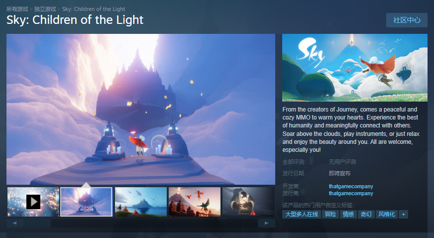 陈星汉Thatgamecompany开发的知名手游光遇(Sky: Children of the Light)上架了PC Steam平台,具体发布日期暂未公开。 光遇是一款宁静舒适的MMO社交游戏,为玩家带来独特的情感体验,感受人性最好的一面。玩家将化身“光之后裔”,承载着先祖的意志,与好友携手,在天空王国的奇妙大陆上,展开一场充满奇遇的冒险。 目前Sky光·遇已经登陆了iOS、安卓、Switch、PS5、PS4,国内由网易代理运营。