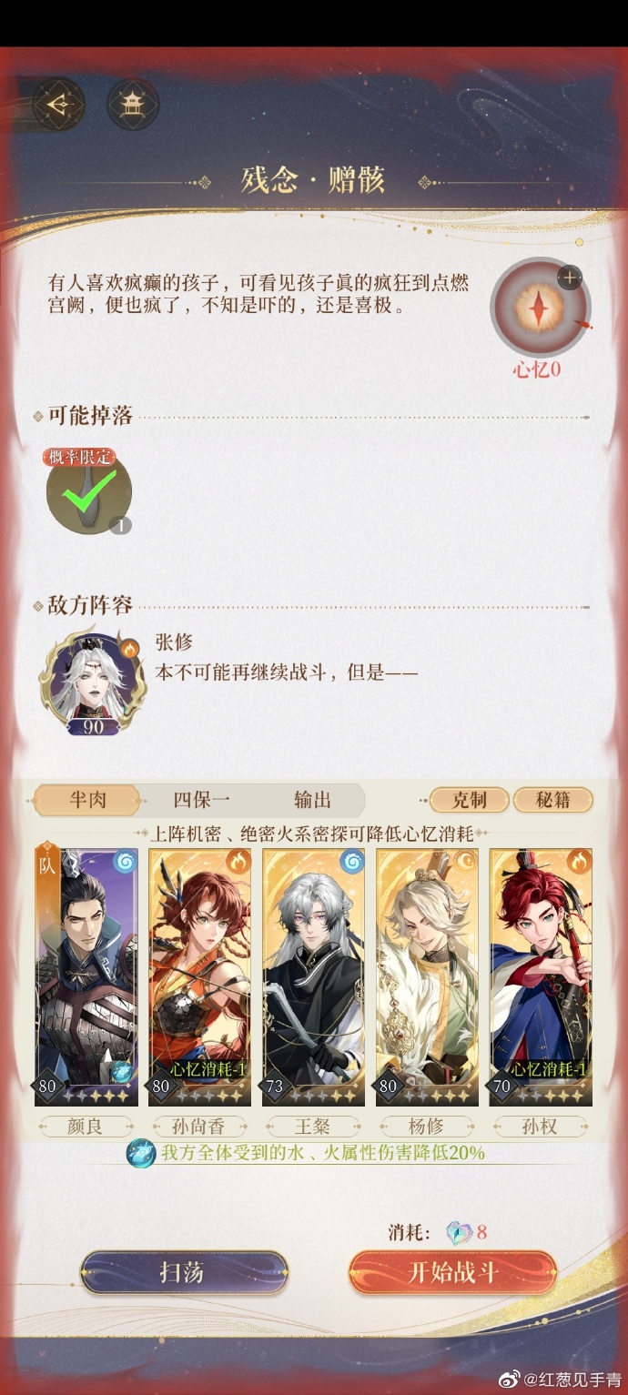 干吉第一次阵亡-般是11-14回合, 往后好点但不强求。全程打张修,注意干吉血量卡在他死了封印大招前把王粲大开出来抗压。如果想要过本的话就要控干吉第二次血量,输出死的时候干吉最好是三分之一血上下。