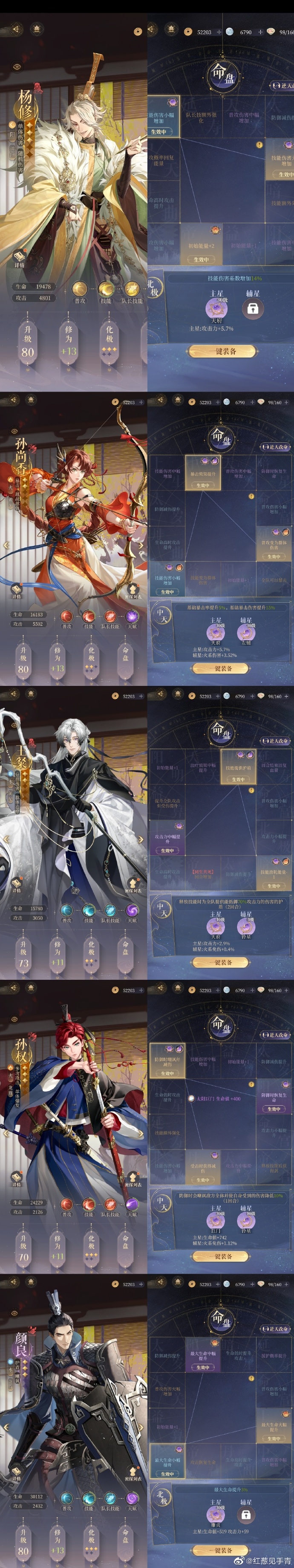 中配无干吉梦魇30 (盾权流) 三星严良80+13命盘三生命(四星或堆血可平替) 二星王粲73+11命盘盾+减cd 漆园蝶12%减伤(10%应该也勉强凑合) 三星杨修80+13初始+2,大小增伤 二星蒜香80+13普攻群,暴击,小增技伤 三星盾权70+11盾权完美盘(嘲讽非必须70+ 11最好是有嘲讽或者蓝色减伤盘)漆园蝶减伤拉满