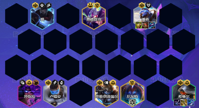 一、阵容分析 1.组成 阵容组成:潘森、卢锡安、希维尔、慎、莎弥拉、厄加特、终极伊泽瑞尔、费德提克 阵容羁绊:5/7未来战士3/4枪手2怪兽1堕落1精英 转职推荐:未来战士纹章、枪手纹章