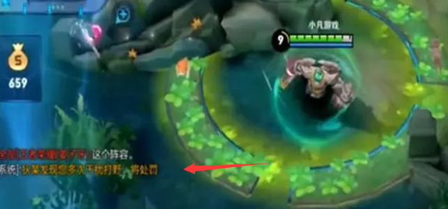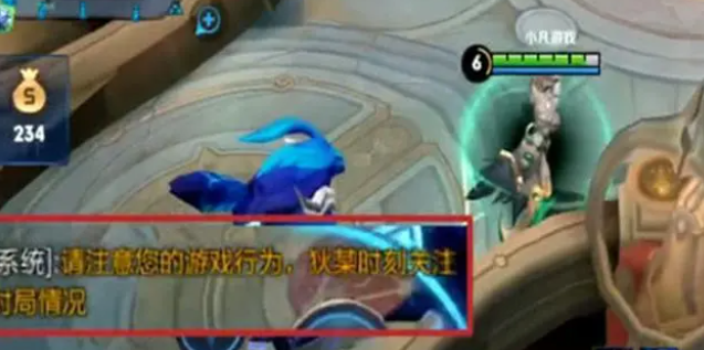 从小地图上,我们可以看到有一个大乔的头像,如此看来,这必定是钟馗和大乔联手玩的泉水钩。同样从小地图上看到,敌方蓝buff处是有标志的,而己方没有,所以钟馗铁定勾走的是对面的蓝buff。(在有过视野的情况下,无论蓝buff在何处,有图标显示即为蓝buff存在,蓝buff死后图标消失)但是这时候,左下角飘来一句话,定睛一看,是系统发来的警告。难道玩家有做出什么出格的事情,比如送人头,语言辱骂吗?玩家表示,除了耍一耍泉水钩,调戏一下蓝buff,自己没有做什么坏事情呀。