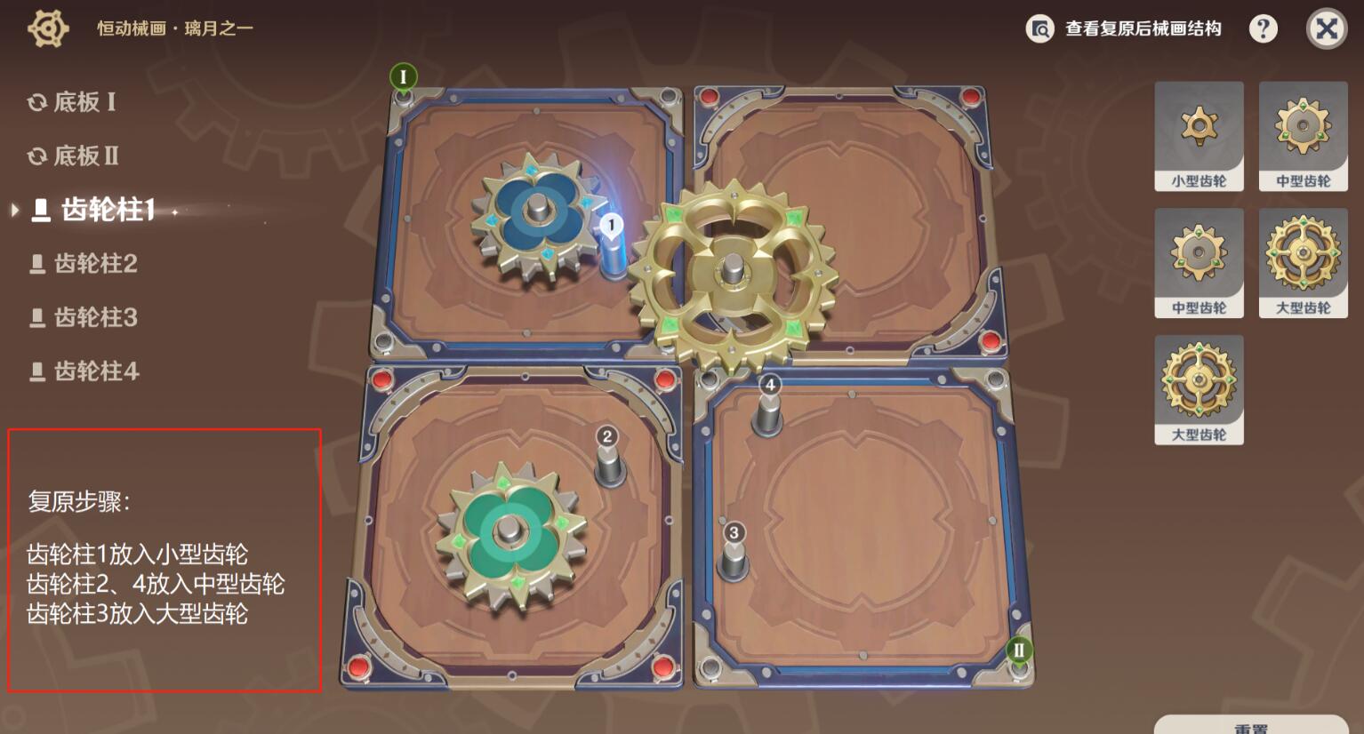 第三步:点击齿轮柱1放入小型齿轮,齿轮柱2、4放入中型齿轮,齿轮柱3放入大型齿轮