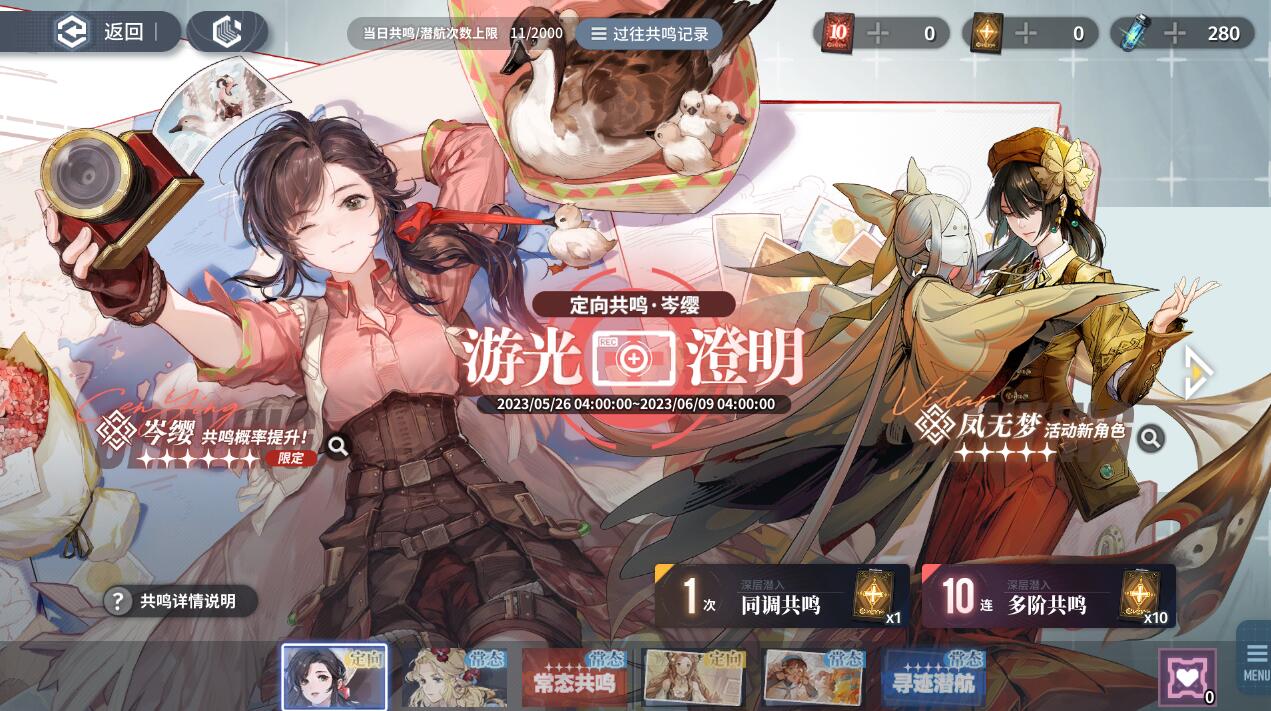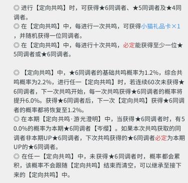 抽卡概率 【定向共鸣】中,★6同调者的基础共鸣概率为1.2%,综合共鸣概率为2.2%,进行任一【定向共鸣】时,若连续60次未获得★6同调者,下一次共鸣开始,每一次共呜获得★6同调者的概率将提升6.0%。获得★6同调者后,下一次【定向共鸣】获得★6同调者的概率都将恢复至1.2%。 保底规则 在本期【定向共鸣·游光澄明】中,当获得★6同调者时,有50.0%的概率为本期★6同调者【岑缨】。如果本次共鸣获取的同调者非本期UP★6同调者,下次共鸣获得的★6同调者必定为本期UP的★6同调者。 具体抽卡规则