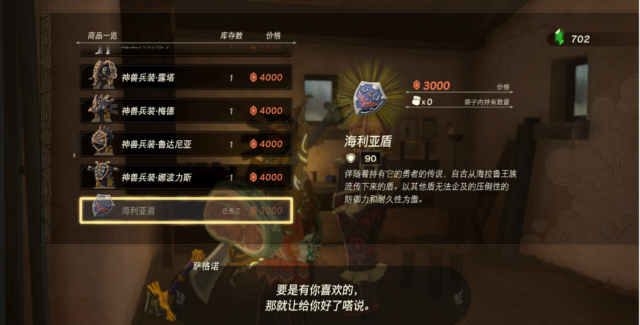 1、本作中有着特殊的设定,不让玩家在背包中携带多个同样的盾。 2、当玩家遇到已售完的情况无法购买如下图所示,需要拿到海利亚盾并且用碎。 3、除了英杰武器,其他都得在地面用碎一次,地下那些举着武器的才会刷得出来。 4、不让你屯一背包全是一样的,在玩家的装备丢失之后,老板也会进货卖给你的。