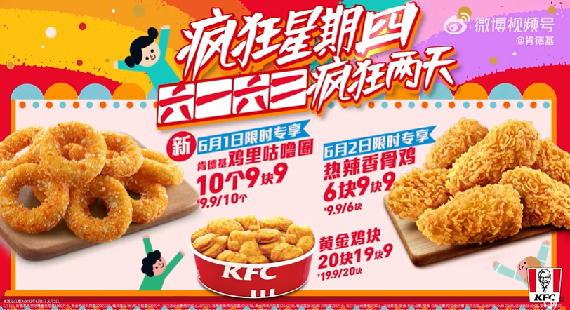 鲜香味美,重磅新品,6月1日专享的【肯德基鸡里咕噜圈】10个¥9.9! 多汁带骨,众望归来,6月2日专享的【热辣香骨鸡】6块¥9.9! 鲜嫩酥脆,人气高涨的【黄金鸡块】20块¥19.9! 金黄酥脆,满口甜蜜的【葡式蛋挞】8个¥29.9! 连续两天疯狂星期四,大大满足你的胃!
