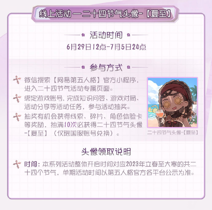 微信搜一搜【网易第五人格】官方小程序,进入二十四节气活动专属页面,绑定游戏账号、参与活动并完成任务,参与活动抽奖,抽满10次必得二十四节气头像-【夏至】。