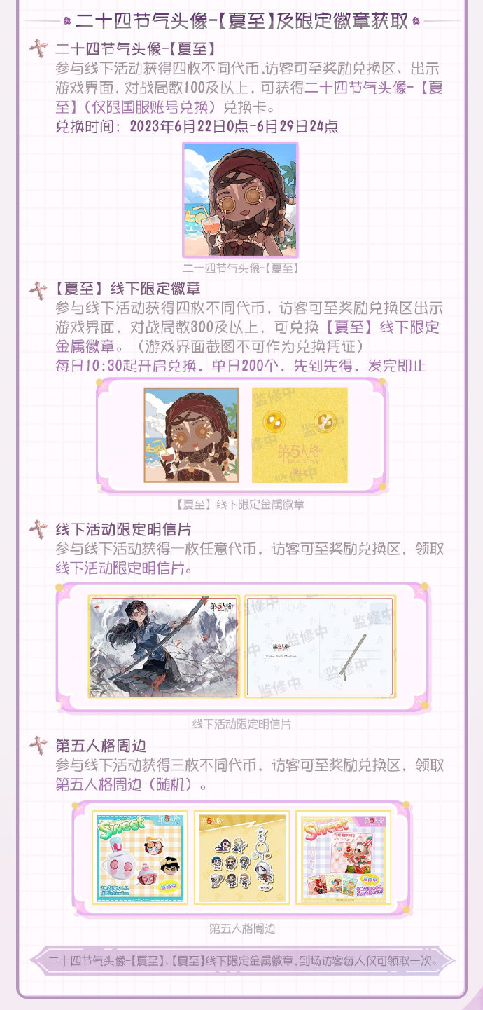 参与现场活动,各位侦探有机会获得二十四节气头像-【夏至】兑换卡、【夏至】线下限量徽章、线下活动限定明信片、第五人格周边等丰富奖励~