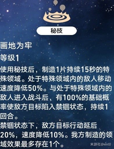 1,创建一个1个持*15*的领域,在领域中降低敌人50%的在地图中的移动速度,如果在领域内进入战斗还会使全体敌人有100%基础概率进入1回合的禁锢状态