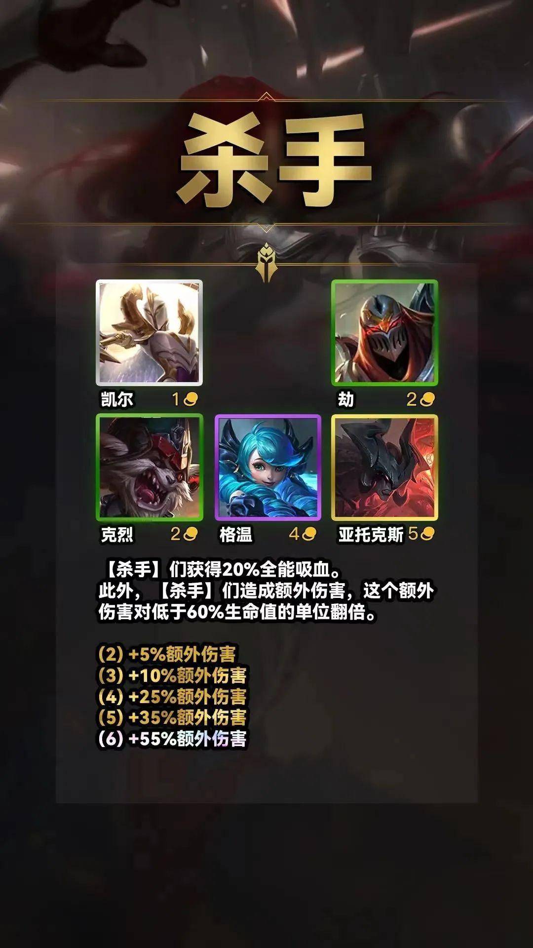 一、羁绊效果 【杀手】们获得20%全能吸血。 此外,【杀手】们造成额外伤害,这个额外伤害对低于60%生命值的单位翻倍。 (2)+5%额外伤害 (3)+10%额外伤害 (4)+25%额外伤害 (5)+35%额外伤害 (6)+55%额外伤害