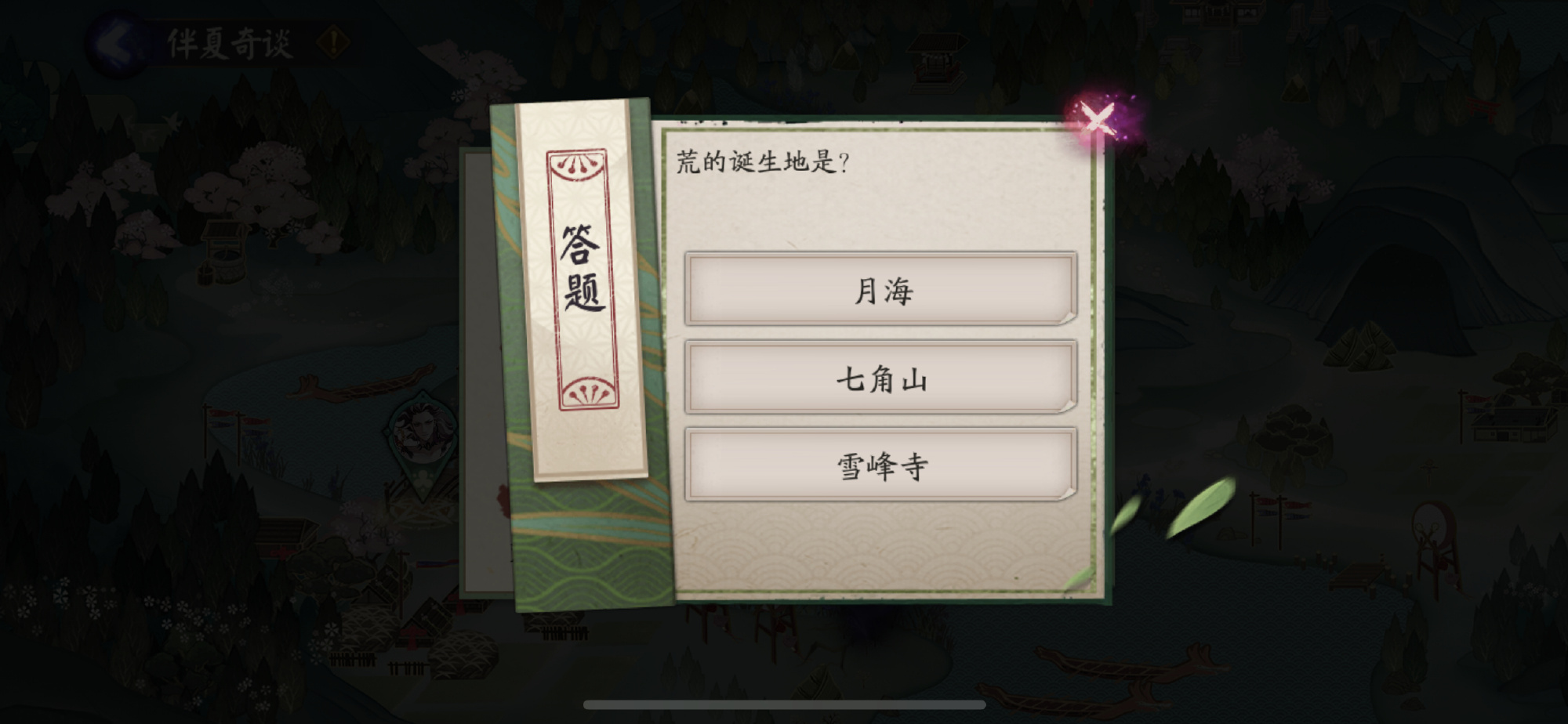 问题 荒的诞生地是 选项 月海、七角山、雪峰寺 答案 月海