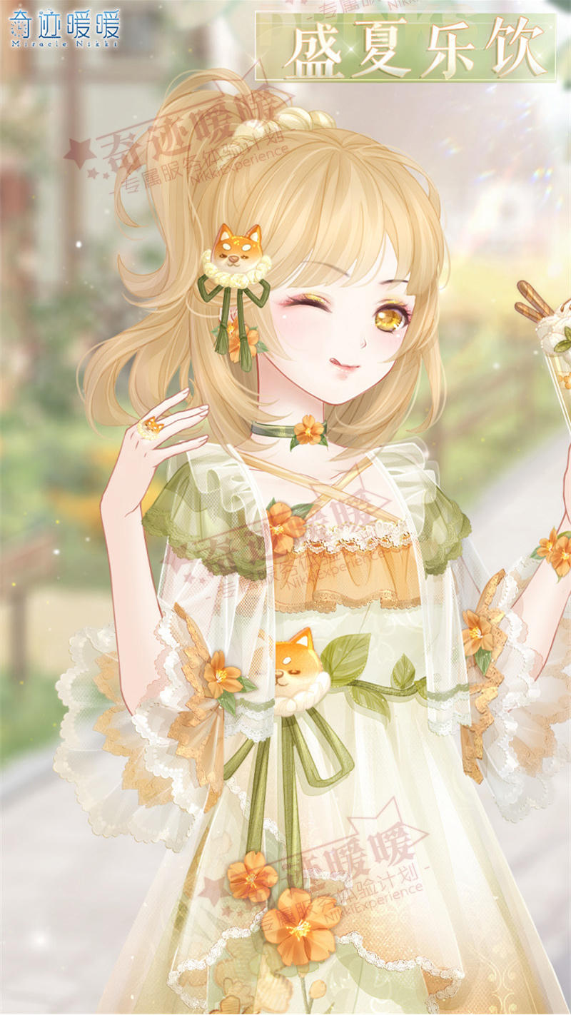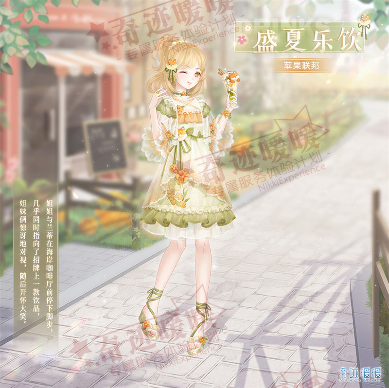 [盛夏乐饮]含正常姿势与特殊姿势,特殊姿势,上衣“紧密羁绊”、“海滨乐事”, 特殊姿势鞋子“心意流露"。*海报展示妆容为“粉黛天桃”。