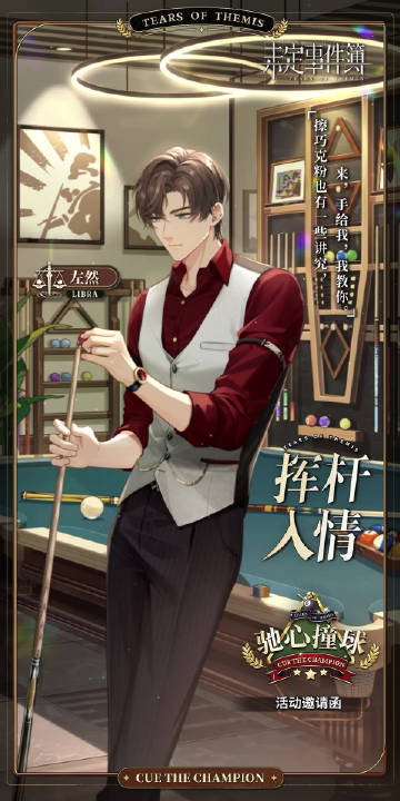 活动期间,律师可通过「驰心撞球」活动界面购买活动主题邀请函:左然【挥杆入情】。