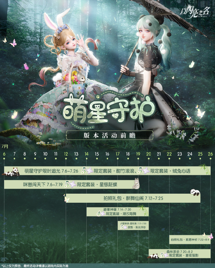 活动一:以闪亮之名x世界自然基金会(WWF)x 一个地球自然基金会 全新联动追光活动【萌星守护】限时惊喜开启 联动来啦!以闪亮之名携手世界自然基金会(WWF)和一个地球自然基金会,邀您与可爱的熊猫、伊犁鼠兔一同踏上自然之旅! 7月6日10:30,限定联动追光活动【萌星守护】上线!全新五星套装及SR羁绊限时登场!该追光活动每登场10次内必获得SR羁绊或限定五星套装部件(直至集齐所有限定五星套装)。此外,【萌星分解】商店也将同期限时开启,通过分解该限时追光活动内的服饰,可兑换限定时装部件可兑换限定时装部件【风沐流年】、【星夜流翩】、【彩虹许愿星】、动态拍照动作【筠伞悠歌】、拍照动作【流风絮语】及头像框、萌星风向标和多种材料道具! 【限时登场套装】 五星套装·酣竹滚滚 ——滚滚趴在树梢上,身子随着风的起伏轻轻晃荡。 五星套装·绒兔心语 ——你能听见伊伊的心声吗?它说——希望人类能与动物伙伴们永远和谐共处。