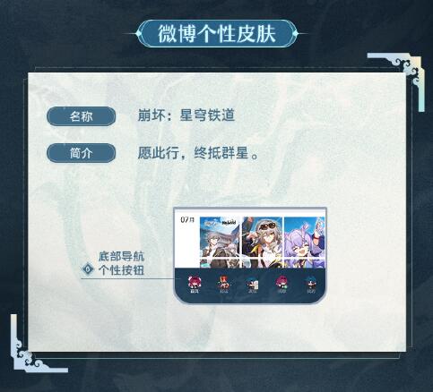 崩坏星穹铁道微博网页活动「仙骸有终」开启~ 参与活动领取星穹铁道专属主题皮肤、主页套装及头像挂件,活动期间完成任务还有机会赢取星琼、实物周边等丰富奖品。 活动时间: 2023年07月19日0:00~2023年08月01日23:59 领取地址:点击进入 非会员限时免费领取时间: 07月19日12:00~14:59 -由于微博饰品原为微博会员用户专属功能。因此,帕姆为开拓者申请了3小时限时通道,在此时间段内,所有开拓者均可领取专属饰品;