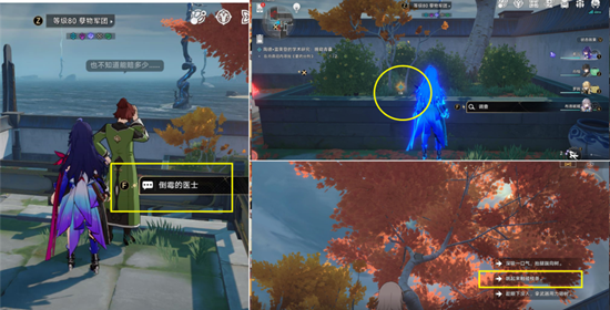 4、第1个地方先找到“倒霉的医士”对话,再去树下调查,选择第2个“跳起来触碰枝条”即可获得物品。