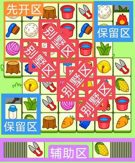 今天有好久不见的变化牌!四个斜着的长形别墅组成,开局先消除橙色区,然后按照一层层均匀消除表面牌,哪里压牌比较多就先消除哪里,必要时可以用盲盒区辅助消除表面牌,尽量还是以别墅区内互相消除为主,蓝色区有叠牌,但是不多,全部保留到后期使用。
