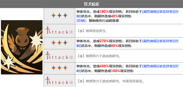 单体攻击,造成180%现实创伤;若目标处于[属性削弱][状态异常][控制]状态中,则额外造成40%现实创伤