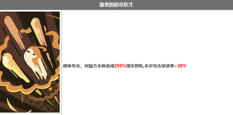 群体攻击,对敌方全体造成250%现实创伤,本次攻击穿透率+30%