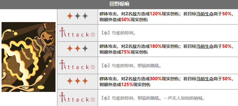 群体攻击,对2名敌方造成120%现实创伤;若目标当前生命高于50%,则额外造成50%现实创伤