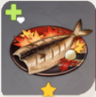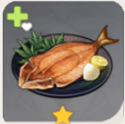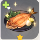 描述:炭火慢烤的鱼干。风干了一夜的鱼,外皮浸润着海风的气息,经烤制后迸发出诱人的咸香,是许多沿海而居的稻妻人最为熟悉的味道。