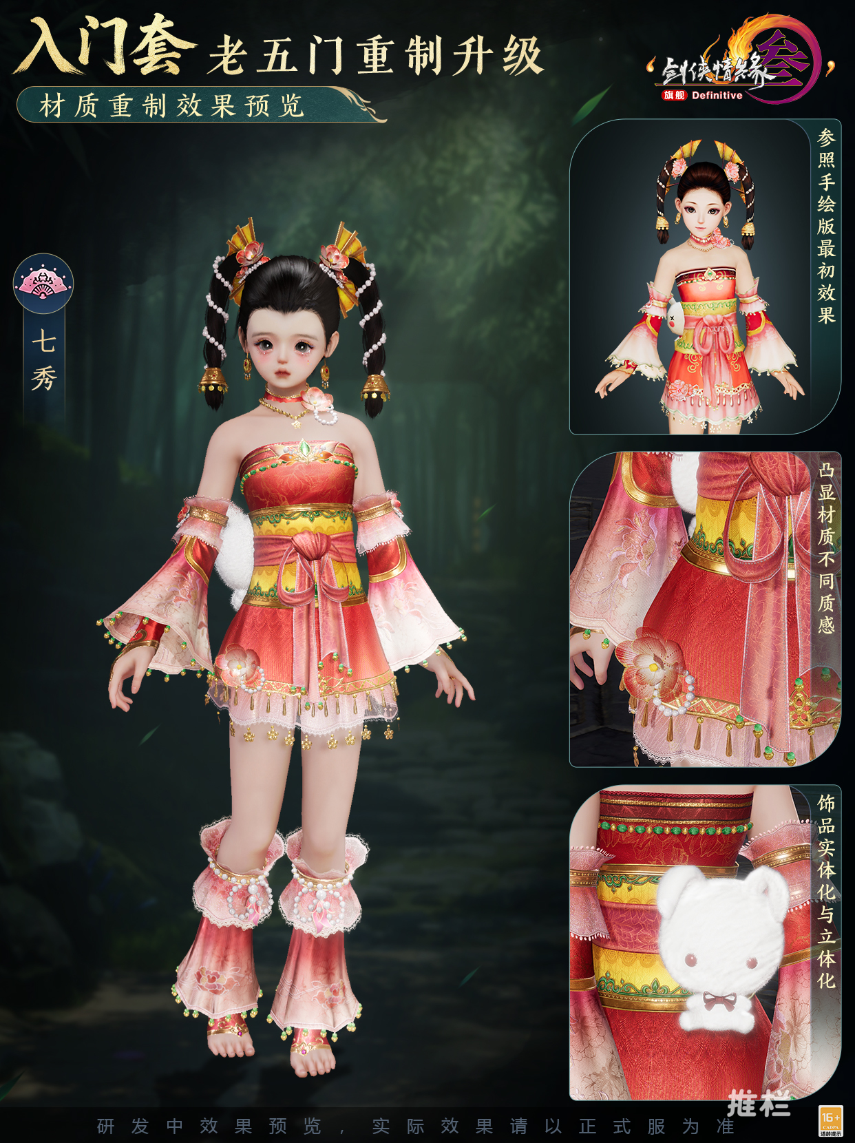 此次老五门入门套校服重制同步参照手绘版效果,通过增加模型面数与升级贴图精度,提升了饰品的实体感与立体感,并精细雕琢不同材质的质感,让经典款式再绽风华!